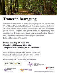 Wir laden Trauernde ein zu einem Spaziergang über die Rosenhöhe / Oberfeld. Beim gemeinsamen Gehen in der Natur können Verlusterfahrungen angesprochen und miteinander geteilt werden. Begleitet und geführt wird der Spaziergang von qualifizierten Trauerbegleiter*innen der veranstaltenden Dienste.